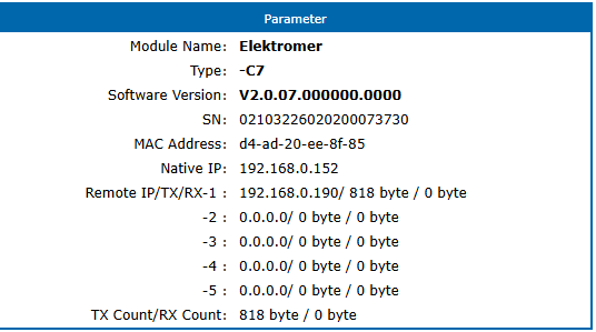 Na stavové stránce převodníku je vidět aktivní klient a počitadlo TX/RX Count. Pokud roste TX počet bajtů, převodník normálně odesílá data z elektroměru do sítě. Na ukázce níže je vidět připojený klient 192.168.0.190 a narůstající TX Count, zatímco RX zůstává nulové. To odpovídá jednosměrnému provozu elektroměr → zákazník, který je uvedený i v dokumentaci ČEZ. fileciteturn6file0
