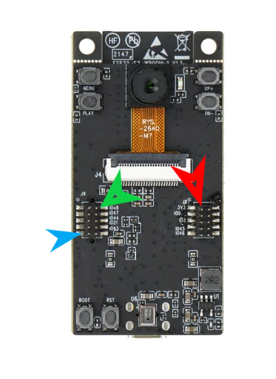 The board does not have an LED that could serve as a camera flash. However, there is an option to use PIN 48, which is typically used to turn on the backlight of the LCD display, as a camera flash. The image shows 3 arrows: