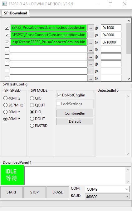 ./esptool -p /dev/ttya0 -b 460800 --before default_reset --after hard_reset --chip esp32 write_flash --flash_mode dio --flash_size 4MB --flash_freq 80m 0x1000 ESP32_PrusaConnectCam.ino.bootloader.bin 0x8000 ESP32_PrusaConnectCam.ino.partitions.bin 0x10000 ESP32_PrusaConnectCam.ino.bin