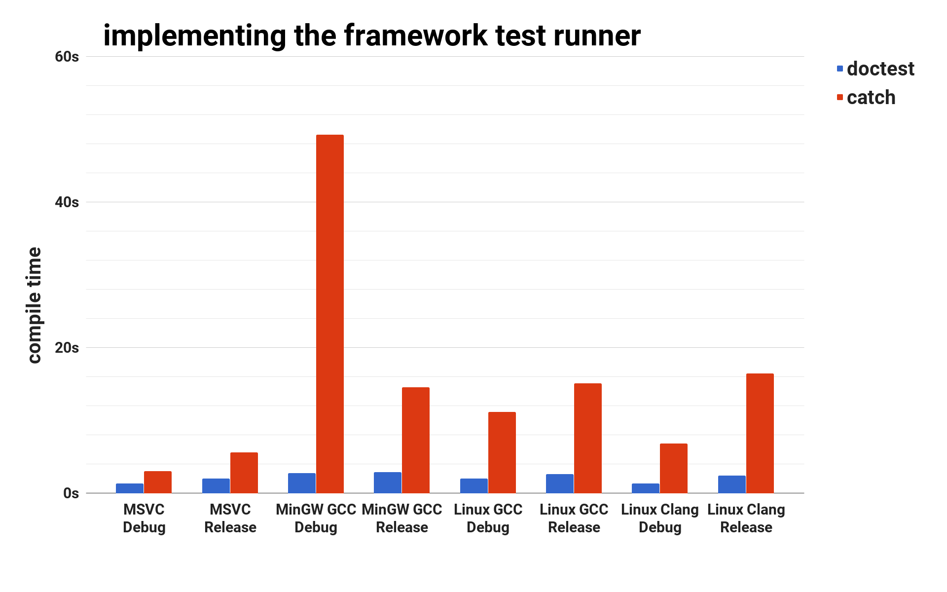 The results are in seconds and are in no way intended to bash Catch - the doctest framework wouldn't exist without it.