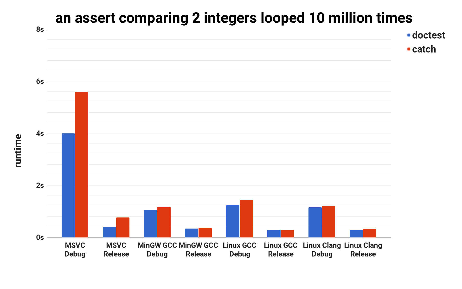 doctest is around ~20% faster than catch for asserts but a few times faster when also logging variables and context (and in the case of one particular compiler over 18 times faster).